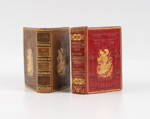 ƒ CERVANTES SAAVEDRA (Miguel de) El ingenioso hidalgo Don Quijote de la Mancha Edicion en miniatura. Paris, Jules Didot, 1827. 2 vol. In-16, veau (diverses teintes : blond, fauve, rouge, vert…), double filet doré, plaque à la cathédrale à...