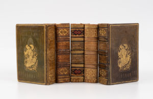 froid sur les plats, au centre fer doré d'un buste de soldat en armure, dos orné, parfois avec petites pièces mosaïquées, tranches dorées (Simier relieur du Roi). Première édition minuscule imprimée par Didot et financée par Joaquin Maria de Ferrer. Elle est illustrée d'un portrait de l'auteur, d'un titre-frontispice gravé sur bois, 8 planches hors texte, une carte à double page des voyages de Don Quichotte.