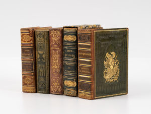 froid sur les plats, au centre fer doré d'un buste de soldat en armure, dos orné, parfois avec petites pièces mosaïquées, tranches dorées (Simier relieur du Roi). Première édition minuscule imprimée par Didot et financée par Joaquin Maria de Ferrer. Elle est illustrée d'un portrait de l'auteur, d'un titre-frontispice gravé sur bois, 8 planches hors texte, une carte à double page des voyages de Don Quichotte.