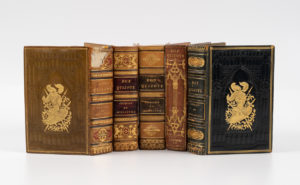 froid sur les plats, au centre fer doré d'un buste de soldat en armure, dos orné, parfois avec petites pièces mosaïquées, tranches dorées (Simier relieur du Roi). Une coiffe manquante. Première édition minuscule imprimée par Didot et financée par Joaquin Maria de Ferrer. Elle est illustrée d'un portrait de l'auteur, d'un titre-frontispice gravé sur bois, 8 planches hors texte, une carte à double page des voyages de Don Quichotte.