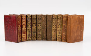filet doré, plaque à la cathédrale à froid sur les plats, dos lisse orné, tranches dorées (Simier relieur du Roi). Deuxième édition minuscule imprimée par Didot et financée par Joaquin Maria de Ferrer. Elle est illustrée d'un portrait de l'auteur, d'un titre-frontispice gravé sur papier glacé répété, un titre gravé sur bois pour chaque partie, 10 planches hors texte, une carte à double page des voyages de Don Quichotte.