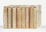 Dali gravées sur bois par Raymond Jacquet et Jean Taricco, et tirées en couleurs à pleine page. Tirage à 4765 exemplaires sur papier vélin pur chiffon de Rives. Celui-ci un des 150, après les 15 de texte (n° 162), accompagnés d'une suite du trait gravé sur cuivre, d'une suite en couleurs et d'une décomposition des couleurs d'une illustration par volume, sous chemises à part. Exemplaire complet des 6 volumes de suites et incomplet de 4 volumes de texte (manque Paradis et Purgatoire) : L'Enfer. 2 vol. de texte, chacun illustré de 17 planches ; et 2 vol. de suites (II, vol. de suites : 15 pl. sur 17 pour la suite en couleurs : 14 pl. sur 17 pour la suite en noir). Le Paradis. 2 vol. de suites. Manque les 2 vol. de texte, chacun illustré de 16 et 17 planches. Le Purgatoire : 2 vol. de suites. Manque les 2 vol. de texte, chacun illustré de 16 et 17 planches. Couvertures et chemises blanches foncées, chemises et étuis très tachés, mouillés. Rousseurs et piqûres, parfois marquées. Paradis I, volume de suites : étui cassé.
