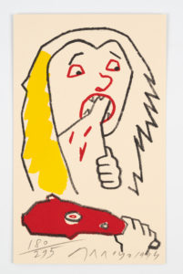 rehaussée à la main, numérotée et signée. À travers deux tableaux de Goya, Eduardo Arroyo compare l'Espagne à Saturne dévorant son fils, puis à Judith assassinant Holopherne. Tirage à 295 exemplaires sur Rivoli, et 15 hors commerce.