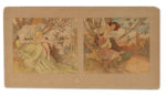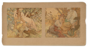 ALFONS MUCHA (1860-1939), ATTRIBUÉ À Les quatre ages de l'homme (variante pour le Chocolat Masson, Chocolat Mexicain) Quatre impressions coupées au sujet, avec le nom de l'âge en bas de chacune, sans le titre en haut ni le calendrier en dessous...