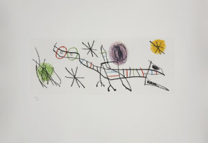 JOAN MIRÓ (1893-1983) ÉRIK SATIE - POEMES ET CHANSONS, 1969 Eau-forte et aquatinte en couleurs sur vélin avec le filigranne LB Numérotée 43/75 Etching and aquatint in colors on wove paper, with LB watermark, justified 43/75 Sujet : 13,5 x 35,5...