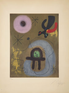 JOAN MIRÓ (1893-1983), D'après MAUVE DE LA LUNE, 1952 Lithographie en couleurs sur vélin Signée, datée et numérotée 152/300 Épreuve légèrement jaunie au recto et au verso. Bande de papier brun sur les bords au verso Lithograph in colors on...