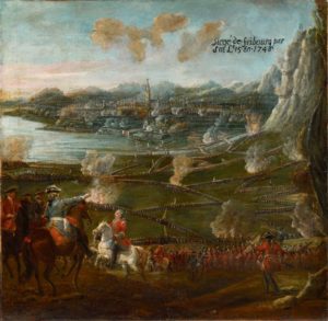 Ecole FRANCAISE du XVIIIe siècle "Le siège de Fribourg par Sa Majesté Louis XV en 1746" Titré …