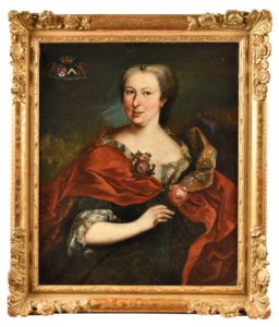 Ecole FRANÇAISE vers 1740 Portrait de dame tenant une rose. Armoiries d'alliance sous couronne de marquis en haut à gauche. Huile sur toile Hauteur : 82 cm Largeur : 66 cm Restaurations anciennes Cadre en bois à fleurs et coquilles dorées.