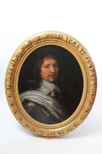 Ecole FRANCAISE vers 1640 Portrait d'homme en armure et au col de dentelle Toile ovale Hauteur : 62 cm Largeur : 49 cm Restaurations anciennes Cadre en bois sculpté et doré du XVIIIe siècle