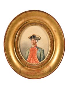 Ecole française du XIXe siècle. « Portrait du Comte Claude Mithon de Senneville de Genouilly (1725-1803), chef d’escadre, chevalier de Saint-Louis et de Saint-Lazare, décoré de l’ordre de Cincinnati ». Aquarelle à vue ovale représentant le comte de ¾ face en uniforme portant ses décorations. 15,5 x 13 cm. Sous verre. Cadre doré avec annotation, (en partie effacée), et annotation au dos « cet officier de marine français participa sous le roi Louis XVI à la campagne pour la guerre d’indépendance des Etats-Unis, nommé chef d’escadre en 1784 ». Portrait reproduit p. 220 dans l’ouvrage du baron de Contenson « La société des Cincinnati de France et la guerre d’Amérique (1778-1783) ».