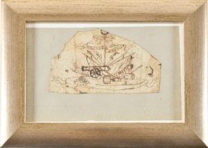 Dessin révolutionnaire sur papier Canon et attributs militaires "Gloire et Patrie" "Liberté Egalité" "république" Fragment 13 x 7,5 cm Epoque Révolutionnaire.