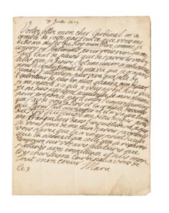 LESZCZYNSKA (Marie). Lettre autographe signée « Marie » au principal ministre André-Hercule de Fleury. S.l., « ce 3 » [3 juillet 1729, d'après une mention ancienne à l'encre d'une autre main]. Une p. in-4, adresse au dos avec 2 cachets armoriés de cire noire conservés. 600/800 « VOTRE LETTRE, MON CHER CARDINAL, M'A COMBLE[E] DE JOYE PAR TOUT CE QUE VOUS ME DITES AU SUJET DU ROY MON PERE [STANISLAS LESZCZYNSKI]. Comme je connois ses sentiments pour vous, rien ne me fait tant de plaisir que de sçavoir les vostres tel[s] que je désire. C'est une union intéressante pour le contentement de ma vie, que je n'aurois jamais d'attention plus vive que celle de l'entretenir de plus en plus. Quan[t] à mon départ, je me raporte à ce que je vous ay dit hier que je ne suis pas assez maîtresse de moi-même pour prendre le parti entre l'empressement que j'ay de voir le roy et la crainte des suites [peut-être une allusion à son état de grossesse, alors qu'elle donnerait naissance à un fils le 4 septembre 1729]... et il n'y a que l'ordre du roy qui puisse me déterminer pour me tranquiliser dans l'inquiétude où je suis. Je vous prie de me faire sçavoir sa volonté. Vous sçavez que je n'en ai point d'autre que la sienne et que celle que je réglerois toujours sur vos avis salutaires que j'attends avec impatience et suis, mon très chérissime cardinal, à vous de tout mon cœur... » LE CARDINAL FLEURY, UN DES GRANDS HOMMES D'ÉTAT DU XVIIIe SIECLE. Très pieux mais non moins rompu à l'exercice mondain, Hercule-André de Fleury (1653-1713) devint aumônier de la reine Marie-Thérèse puis aumônier trimestriel du roi, et accompagna le cardinal Forbin-Janson dans sa mission à Rome en 1690. En 1698, il obtint l'évêché de Fréjus qu'il ne gagna qu'en 1701, mais où il se montra un évêque apostolique proche des populations. Il travailla toujours en faveur de la paix, notamment en 1707 lors de la guerre de Succession d'Espagne, quand il reçut à son évêché Victor-Amédée de Savoie et le prince Eugène venus assiéger Toulon. Son attitude impressionna, et on lui proposa un archevêché qu'il refusa ; il renonça même à son siège de Fréjus et revint à Versailles où il reçut le titre de précepteur du futur Louis XV. Il gagna la confiance de celui-ci, et fut nommé en 1726 principal ministre (la même année le pape le faisait cardinal) : il mena une politique d'apaisement sur tous les plans, intérieur, extérieur et religieux.