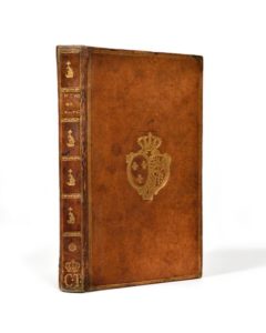 [MARIE-ANTOINETTE]. – THEATRE DE CAMPAGNE, ou recueil de parades les plus amusantes, propres au délassement de l'esprit ; jouées sur des théâtres bourgeois. À Nugopolis, et se trouve à Paris, chez la veuve Duchesne, 1767. In-8, 5 parties en pagination et signature multiples avec titre général et quelques titres particuliers, veau fauve moucheté, dos lisse cloisonné orné d'un fer au dauphin doré répété et d'un fleuron doré, avec chiffre « CT » couronné doré en queue, triple filet doré encadrant les plats avec fleurons d'angle et armoiries de la reine dorées au centre, coupes filetées, roulette intérieure dorée, tranches mouchetées de rouge ; mors, coiffes et coins discrètement restaurés, quelques taches sur les plats (reliure de l'époque). VERSION LA PLUS COMPLETE DE CE RECUEIL DE COMEDIES, qui fut constitué en plusieurs temps : dans sa première version publiée en 1755 chez Nicolas-Bonaventure Duchesne, il était intitulé Théâtre de campagne ou les Débauches de l'esprit et comprenait 5 pièces. En 1758, dans sa seconde version, sous le même titre et chez le même éditeur, il fut augmenté de la comédie Les Deux biscuits, avant d'être ensuite complété ici chez la veuve Duchesne, Marie-Antoinette Cailleau, d'une septième pièce, La Mort de Bucéphale. Nugopolis, dans l'adresse du livre, est une composition fantaisiste sur le mot grec polis, ville, et le mot latin nugæ, bagatelles, sornettes, petits riens. FARCES BOUFFONNES SERVANT DANS UN STYLE ELEVE PARODIQUE UN PROPOS VOLONTIERS EROTIQUE VOIRE SCABREUX : [Rousseau (Pierre)]. LA MORT DE BUCEPHALE, tragédie burlesque en un acte et en vers. 30 pp. chiffrées 3 à 32. Pièce originellement parue en 1749. — [Grandval (Charles-François Racot de)]. L'EUNUQUE ou la Fidèle infidélité. Parade, mêlée de prose de vers. 47-(une blanche) pp. Pièce originellement parue en 1750. — [Grandval (Nicolas Racot de)]. AGATHE, tragédie. 50 pp. chiffrées 3 à 52. Exemplaire de l'édition donnée séparément en 1756 par Duchesne, sans son feuillet de titre. Cette comédie avait originellement paru dans le recueil Duchesne de 1755. — [Grandval (Charles-François Racot de)]. LES DEUX BISCUITS, tragédie. Avec page de titre particulière : Se vend à Astracan [Paris], chez un libraire, 1759. 31-(une blanche) pp. Exemplaire de l'édition séparée de 1759 de cette pièce originellement parue en 1752. — [Grandval (Nicolas Racot de) ou Sulpice-Edme Gaubier de Barrault]. LE POT DE CHAMBRE CASSE, tragédie pour rire, ou comédie pour pleurer. Avec page de titre particulière : À Ridiculomanie, chez Georges l'Admirateur, [1749]. 48 pp. Exemplaire de l'édition de 1749. — [Grandval (Charles-François Racot de)]. SIROP-AU-CUL ou l'Heureuse délivrance. 48 pp. Pièce originellement parue en 1752. — [Boudin (Pierre) ou Jean-Joseph Vadé]. MADAME ENGUEULE, ou les Accords poissards, comédie-parade. 48 pp. Pièce en langage poissard, originellement parue en 1754. Les comédiens Charles-François Racot de Grandval, dit Grandval fils, et Henri-Louis Cain dit Lekain s'étaient associés pour organiser rue Blanche, alors lieu champêtre, un théâtre clandestin où ils pouvaient donner des comédies légères voire scabreuses, dont certaines écrites par Grandval fils lui-même – Antoine-René d'Argenson, marquis de Paulmy, en fut un des familiers. Exemplaire aux armes de la reine Marie-Antoinette (OHR, pl. n° 2508, fer n° 4, en format intermédiaire) AVEC CHIFFRE COURONNE DE LA BIBLIOTHEQUE DU PETIT-TRIANON (doré en queue de dos, fers absents d'OHR). « IL SEMBLE AVOIR ETE LE SEUL DE CE GENRE A TRIANON » (Françoise Bléchet, dans Eros invictus). Dès l'arrivée de Marie-Antoinette en France, un noyau de bibliothèque lui fut constitué par l'abbé Claude-François Lysarde de Radonvilliers, sous-précepteur des Enfants de France, et confié à la garde de l'historien et avocat Jacob-Nicolas Moreau, qui envisagea son rôle avec le plus grand sérieux. Cependant, Marie-Antoinette s'accorda mal avec Jacob-Nicolas Moreau, sans doute en raison d'intrigues, et confia le soin d'enrichir sa bibliothèque à son secrétaire Pierre-Dominique Berthollet dit Campan, qu'elle chargea également de faire le régisseur de son petit théâtre. Ainsi, Marie-Antoinette eut deux bibliothèques, l'une à Versailles, où était conservés des ouvrages plus austères, l'autre à Trianon, où elle réunit principalement des romans et du théâtre, en des volumes reliés comme ici en veau à ses armes avec chiffre « CT ». Ce sont ces lectures-là que Marie-Antoinette affectionnait véritablement, comme en ont attesté des témoins tels sa femme de chambre Henriette Campan ou l'ambassadeur d'Autriche Florimond de Mercy-Argenteau. L'art dramatique était par ailleurs son passe-temps favori, et elle organisait dans ses théâtres privés des représentations auxquelles elle participait elle-même. LES LIVRES AUX ARMES DE MARIE-ANTOINETTE SONT RARES EN MAINS PRIVEES. En 1789, ceux que possédait Marie-Antoinette à Versailles la suivirent aux Tuileries quand elle dut y emménager avec Louis XVI : ils furent sais