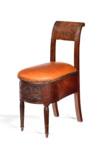 BIDET EN ACAJOU REPOSANT SUR QUATRE PIEDS dont deux sabres à l’arrière et deux pieds cannes rudentés à l’avant. Le dossier est à enroulement et propose un décor sculpté de vase fleuri sur le bandeau et des cannelures sur les montants. L’assise est également richement sculptée en façade d’un trophée composé d’un carquois, d’un arc, d’un flambeau, d’une couronne d’olivier et d’un ruban. Le tour de l’assise est sculpté d’un ruban torse. Une petite trape laisse découvrir un rangement au pied du dossier. L’assise est fermée par une planche garnie de cuir. De nombreuses marques à l’encre sont visibles sous l’assise et sous le couvercle. Il y a également une trace d’étiquette. La provenance de ce bidet est multiple : sans doute une commande royale ou pour le Garde Meuble, nous le trouvons une première fois au château de Rambouillet en 1817, puis au château de Fontainebleau jusqu’au moins 1849. Epoque Directoire Restaurations d’usage, restaurations à prévoir, cuir postérieur H. 83 x L. 32 x P. 57 cm Références découvertes des numéros d’inventaires : - R 752 : « Un bidet à dos renversé, acajou, maroquin vert » (Garde robe - Appartement 6 - Premier étage), Inventaire de 1817 des Entrées et Sorties du château de Rambouillet - F 12882 : « Une chaise d’affaire acajou » (Garde robe - Chambre à coucher numéro 9 - Aile des Ministres), Inventaire 1817-1819 Palais de Fontainebleau - F 19379 : « Quatre bidets à dos en acajou, cuvette en faïence » (Service général) - Inventaire 1849 Palais de Fontainebleau - 6240 - F 10649