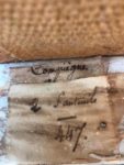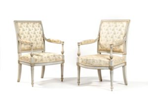 FAUTEUILS DU CHATEAU DE COMPIEGNE Paire de fauteuils en hêtre mouluré et peint, à dossier plat rectangulaire, les supports d’accotoirs en balustre et reposant sur des pieds avant fuselés à bagues et des pieds arrière en sabre Etiquettes inscrites à l’encre : Compiègne Petites Ecuries / N°1 / Cabinet de Travail / 2 fauteuils et 2 fauteuils / 447 ; Numéros à l’encre : C 10212 et C458 ; marque au feu CP couronné Accidents et restaurations. Fin du XVIIIe siècle. H : 92 cm, L : 60 cm Provenance : Château de Compiègne à la fin du XVIIIe siècle et au XIXe siècle.