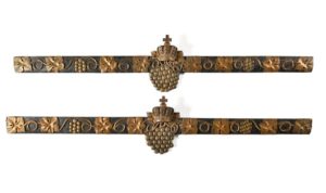 Paire de bois sculptés patinés et dorés à décor de pampres de vigne surmontés d'une couronne. Long. 148cm Fin du XIXe Siècle Restaurations.