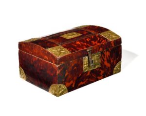 Coffret en écaille rouge et laiton repoussé et argenté, à décor de fleurs dans les écoinçons et armoiries comtales au centre. XVIIe siècle. H : 13,5 cm, L : 26 cm, L : 18 cm