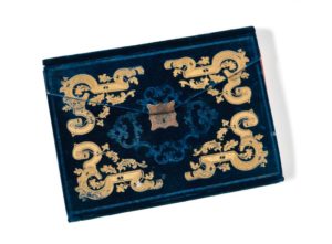 PORTEFEUILLE en velours bleu gauffré d'arabesques dont certains dorés, fermoir en argent ciselé …