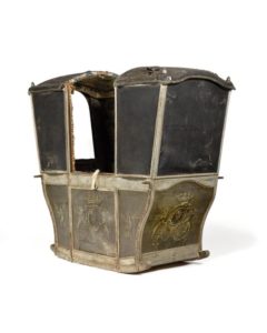 CHAISE A PORTEUR DOUBLE EN VIS A VIS, En bois recouvert de toile peinte des armoiries de la famille de Layrolles (Languedoc) et de cuir, à trois volets escamotables. Banquettes en bois en vis à vis. Garni à l’intérieur d’une tapisserie, à décor de bouquets, chardons et feuillages, portière à deux poches à rabats. Toit recouvert de cuir bordé d’un cloutage, orné aux quatre coins de motifs. 70 x 135 x Ht 153 cm. Dans l’état (Une partie du toit à refixer) Fin XVIIe, début du XVIIIe siècle. Nous remercions Monsieur Alban PERES de son aide dans l’identification de ces armoiries.