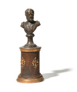 HENRI IV Buste en bronze à patine brune sur piédouche monté sur socle cylindrique en bois et décoré de fleurs de lys en laiton doré. Travail de la fin du XIXeme siècle. H. 15 cm