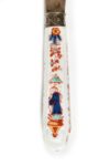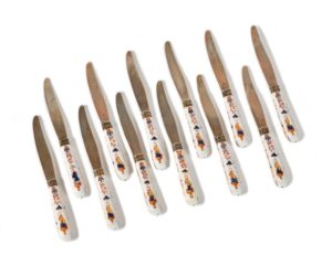 Suite de douze couteaux à lames argent et manches en porcelaine tendre de Mennecy Villeroy. Les manches en porcelaine moulurés à décor de chinois sous une branche fleurie. Chaque face présentant un chinois en tenue jaune ou bleue. Viroles en argent à frise d’oves. Lames en argent, poinçons Minerve 2e Titre et poinçons d’orfèvre. Très bon état, sauf deux manches restaurés. 21 cm XVIIIe siècle.