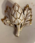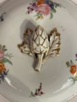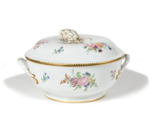 Manufacture royale de porcelaine de Mgr. le Dauphin. Grande soupière en porcelaine peinte à décor de fleurs et or. Prise en forme d'artichaut. XVIIIe Siècle Marque en rouge au dessous. Haut. 20 Diam. 27.5 cm