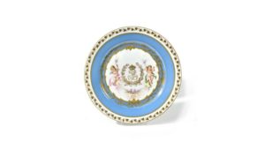 ASSIETTE au chiffre du Roi Louis-Philippe et frise de feuilles de vigne à l’or surdécorée d’angelots. Marques apocryphes de Sèvres et du Château des Tuileries. Diam : 24 cm. A.B.E. Fin du XIXe siècle, début du XXe siècle.