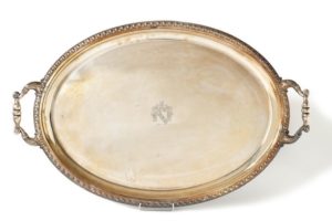 GRAND PLATEAU OVALE EN CUIVRE ARGENTE, à deux poignées, aux « armes de la Famille Lasalle Von …