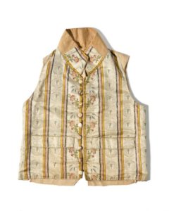 Gilet en soie bordé de fleurs, feuillages et médaillons, fermant par neuf boutons recouverts en suite, (usure), muni de deux larges poches à revers droit, doublé de toile écrue, (renforcé postérieurement au col). A.B.E. Epoque Louis XV/Louis XVI.