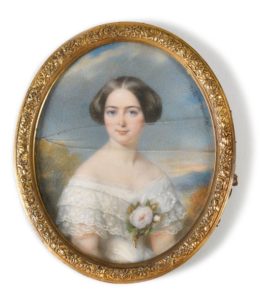 François MEURET (1800-1887) « Portrait d’Élisabeth de Mac Mahon en buste sur fond de paysages. » Grande miniature ovale signée à droite et datée 1854 » 9,5 x 7,7 cm. Sous verre (cassures). Cadre en laiton doré à décor fleuri. Deux étiquettes à la plume au dos « Miniature de la Mal de Ma(…) Mah( ..) » et « 110 Cesse de Piennes » Provenance : familles Mac Mahon – La Croix de Castries Élisabeth de Mac Mahon, née Élisabeth Charlotte Sophie de La Croix de Castries (1834-1900). Elle épouse en mars 1854 Patrice de Mac Mahon, maréchal de France, président de la République française du 24 mai 1873 au 30 janvier 1879. Présidente du comité central de la Croix-Rouge française Certificat Cites FR2307504412-K
