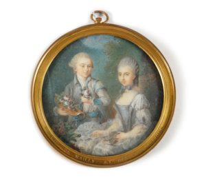 École française du XVIIIe siècle. « Le Duc de Castries et la Vicomtesse de Mailly » Miniature ronde sous verre. Cadre à suspendre gravé sur le pourtour « Vsse de MAILLY et DUC DE CASTRIES » Diam : 6 cm. B.E. Il s’agit des deux enfants du Maréchal : Adélaïde (1749-1825) et Armand, futur duc (1756-1842) Provenance : familles Mac Mahon – La Croix de Castries Certificat Cites FR2307504411-K