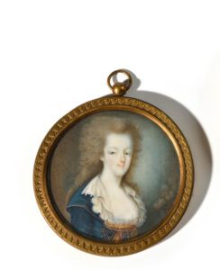Ecole française de la fin du XVIIIe siècle. « Portrait de la Reine Marie Antoinette en buste » Miniature ronde. 7 cm. Sous verre cerclé de laiton. Marqué à la plume sur une étiquette d’Alphonse GIROUX « La Reine Marie Antoinette par la Princesse de Ligne » A.B.E. Provenance : familles Mac Mahon – La Croix de Castries Certificat Cites FR2307504415-K