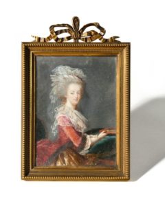 Portrait miniature de Marie-Antoinette en robe cramoisie au livre. D'après Madame Vigée Le Brun. Dans un cadre à poser en bronze doré à frise de perles et surmonté d'un noeud. Epoque Restauration 14 x 10 cm à vue