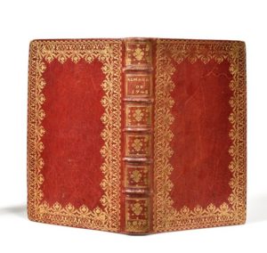 ALMANACH ROYAL. À Paris, chez la veuve d'Houry, et le Breton, petit-fils d'Houry, 1748. In-8, maroquin rouge, dos à nerfs cloisonné et fleuronné, dentelle dorée encadrant les plats, coupes ornées, doublures et gardes de papier doré estampé de motifs floraux mauves (reliure de l'époque). Non collationné, usures.