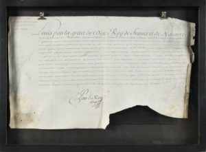 Lot de deux documents : Commission de capitaine du régiment d’infanterie du Roy. Sur vélin (déchirures), au nom du Lieutenant d’ESCOUVILLE. Fait à Versailles le 24 avril 1734. Signé « Louis ». 50 x 30 cm Encadré sous verre. Commission de lieutenant colonel du régiment de cuirassiers du Roy. Sur vélin (manques en bas à droite), au nom du capitaine BLOUTONVILLIERS. Fait à Versailles le 4 avril 1735. Signé « Louis ». 50 x 30 cm. Encadré sous verre.