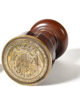 Important cachet sceau, rond, en bronze, aux armes de la famille Rohan, de Louise Gabrielle épouse d’Hercule Meriadec de Rohan Soubise, duc de Rohan, prince Soubise et prince de Maubuisson. Poignée en bois marron tourné (accidents, manques). Diam. : 63 mm. Ht. : 115 mm. B.E. Belle fabrication commémorative du XIXè siècle.