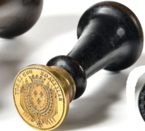 Baillage Dun Le Roy aux armes de Berry. Cachet sceau à cire ovale, en laiton. Poignée en bois noirci. A.B.E. Epoque Restauration. Dun sur Oron (Cher), qui porta le nom de Dun le Roi jusqu’en 1880.