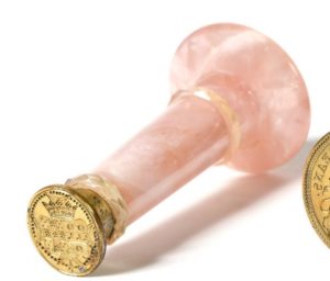 Marquis de Louvencourt. Cachet ovale, en laiton aux armoiries d'alliance de Joseph de Louvencourt (1770-1841), premier marquis de Louvencourt, chevau-léger de la Garde du Roi, chevalier de Saint-Louis et de Saint-Jean de Jérusalem, et de son épouse Aglaé de Sainte-Aldégonde (1773-1848) Poignée en quartz rose et cristal. 25 x 22 mm. B.E. XIXe siècle