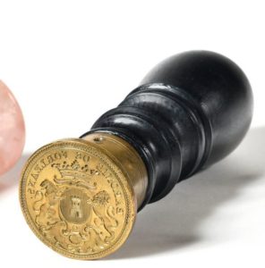 Fort cachet sceau rond en bronze aux armes de Marc-Antoine Chartraire (1737-1781), marquis de Bourbonne, président au Parlement de Bourgogne, dernier baron de Forléans, sous couronne de marquis avec en légende « Baronie de Forleans ». Diam. : 38,9 mm. Poignée en ébène tourné. B.E. Milieu du XVIIIe siècle.