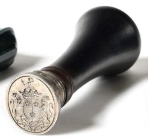 Cachet sceau ovale en argent aux grandes armes de la famille d’Argouges (Normandie, Bretagne) sous couronne ducale. Il s'agit là de la branche des marquis de Rannes, ou de celle des marquis d'Achères. 24,2 x 21,4 mm. Poignée en ébène tourné. XVIIIè siècle.