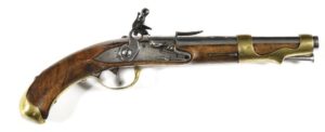 Pistolet d’arçon à silex modèle 1763/66. Canon rond, à méplats au tonnerre, poinçonné. Platine avec trace de poinçon et chien à corps plats. Bassinet rond en fer. Garnitures en laiton, non poinçonnées. Monture en noyer. Crosse à long fut. Baguette en fer (postérieure). Long. : 41 cm. E.M. (en l’état, remontage, contre-platine non au modèle, pommeau aminci).
