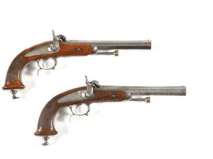 Paire de pistolets à percussion d’officier modèle 1833. Canons à pans en damas, à rayures …