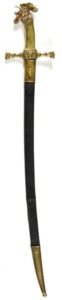 Sabre dit de sapeur mais probablement pour un tambour major. Poignée au coq hurlant en bronze. Garde à deux quillons et noeud de corps « aux lions ». Fine lame à dos, contre tranchant, gouttière et pans creux (piqures). Fourreau en cuir à deux garnitures en laiton. E.M. Vers 1830/1850 (remontage composite, restauration au bec supérieur). Long.: 94 cm.