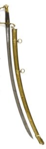 Sabre d’officier de cavalerie légère. Monture en laiton. Poignée en bois noirci quadrillé. Calotte à «côtes de melon ». Garde à une branche et deux oreillons en navette. Quillon courbé vers la pointe. Lame courbe, à dos plat et pans creux, gravée au tiers (piqures). Fourreau en laiton à deux bracelets (coups et enfoncements). En l’état. XIXè siècle (remontage composite). Long. : 96 cm.