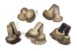 Cinq paires d’épaulettes : -une de lieutenant du 47e de ligne. Époque Second Empire. Doublure en drap bleu. A.B.E. (Oxydée) -une d’officier étranger (allemand ?). Recouvertes de drap bleu nuit, à galon de passementerie argent et filets noirs. Tournantes en laiton doré. Franges en passementerie argent et passementerie noire. Doublures en drap rouge. Boutons demi grelots unis. XIXe siècle. Trois paires d'épaulettes d’officier de la Garde nationale : -Commandant, d’époque IIe République. Doublure en drap bleu. Oxydations. -Capitaine, d’époque IIe République. Doublure en drap bleu. -Lieutenant, d’époque Monarchie de Juillet. Doublure en drap rouge (manques). A.B.E.