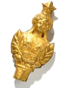 Motif de hampe de drapeau de pavoisement, à la République couronnée d’une étoile (petit manque). En laiton estampé et doré. Ht : 21,5 cm. B.E. IIIe République.
