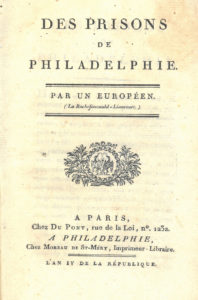 rare édition originale, illustrée d'un tableau dépliant du nombre et de l'espèce des détenus. Initiée par les Quakers, cette politique pénitentiaire novatrice, à rebours de la pratique féroce en vigueur, est beaucoup plus douce, avec des condamnations à mort réservées aux crimes les plus graves, et un travail rémunéré pour les condamnés, libérant ainsi l'État de la charge de leur entretien et leur permettant d'envisager une réinsertion, donnée comme le but de leur emprisonnement par un système de larges remises de peines (Michel Foucault, Surveiller et punir, p. 126).