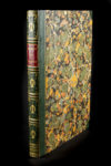 mosaïqué de rouge, non rogné (Reliure pastiche moderne). Édition originale de cet important ouvrage relatif à la fondation de la Banque de France, publiée quatre ans après la création de cette institution par Bonaparte. Elle contient les Statuts primitifs de la Banque de France, qui datent du 24 pluviôse an VIII (13 février 1800), son règlement intérieur, la liste de ses 200 actionnaires, ainsi que la loi qui institua l'établissement comme banque unique à Paris. On a relié à la suite : ASSEMBLÉE-GÉNÉRALE des actionnaires de la Banque de France, du XXV Vendémiaire an XIII. S.l.n.n. [à la fin] : De l'Imprimerie de la Banque de France, s.d. Compte-rendu de cette assemblée générale du 25 vendémiaire an XIII (17 octobre 1804), avec le Discours du président de la Banque de France, Jean-Frédéric Perregaux, le rapport des censeurs prononcé par Martin Puech, et l'arrêté de l'assemblée générale des actionnaires. Cette pièce a une collation différente de celle numérisée sur le site Gallica (un feuillet de faux-titre et 21 pages au lieu de 38 pages). Très bel exemplaire, dans une impeccable reliure dans le goût de l'époque. Les plats de la première reliure ont été employés, et la pièce de titre d'origine a été conservée dans le volume.