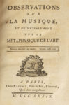 CHABANON (Michel Paul Guy de). Observations sur la musique, et principalement sur la métaphysique de l'art. Paris, Pissot, 1779. In-8, demi-basane fauve, filets dorés au dos (Reliure de l'époque). Édition originale. Chabanon a joué un rôle...