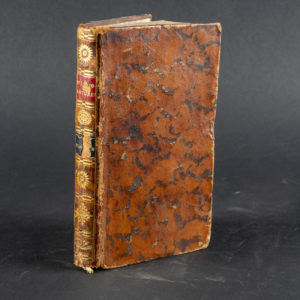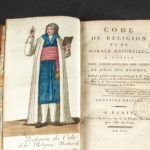 et noire, tranches jaspées (Reliure de l'époque). Bréviaire des adeptes du culte de la théophilanthropie, mouvement déiste fondé par l'auteur et établi sur deux idées principales : la croyance en Dieu et l'amour des hommes. (Caillet, n°2310.) Frontispice colorié représentant un Professeur du culte de la religion naturelle en costume, et 24 pages de musique notée. Cachet humide d'une congrégation religieuse sur le titre. Petite déchirure sans manque à deux feuillets, frottements à la reliure, manque à l'une des pièces au dos.